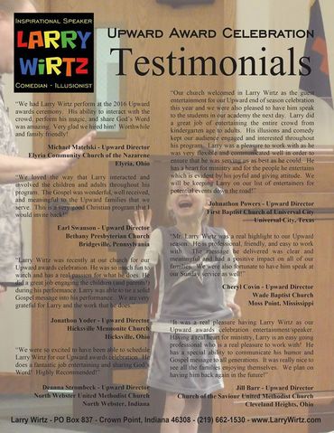 The end of the season celebration is the final time for fellowship, acknowledgement of a season of hard work and accomplishments. The humor, illusions and Christ-centered messages from Larry Wirtz has added much excitement and meaning to many Upward Sports Award Celebrations across the United States for the last couple of decades.